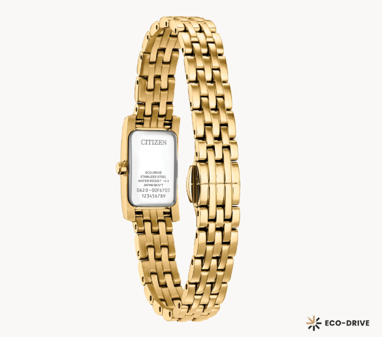This elegant Citizen Eco-Drive watch features a rectangular case with crystal-set accents and a mother of pearl dial. The timepiece has a lustrous yellow gold-tone finish and a matching bracelet, offering a luxurious and sophisticated aesthetic. The dial displays classic numerals and the Citizen logo, blending functionality with timeless design.