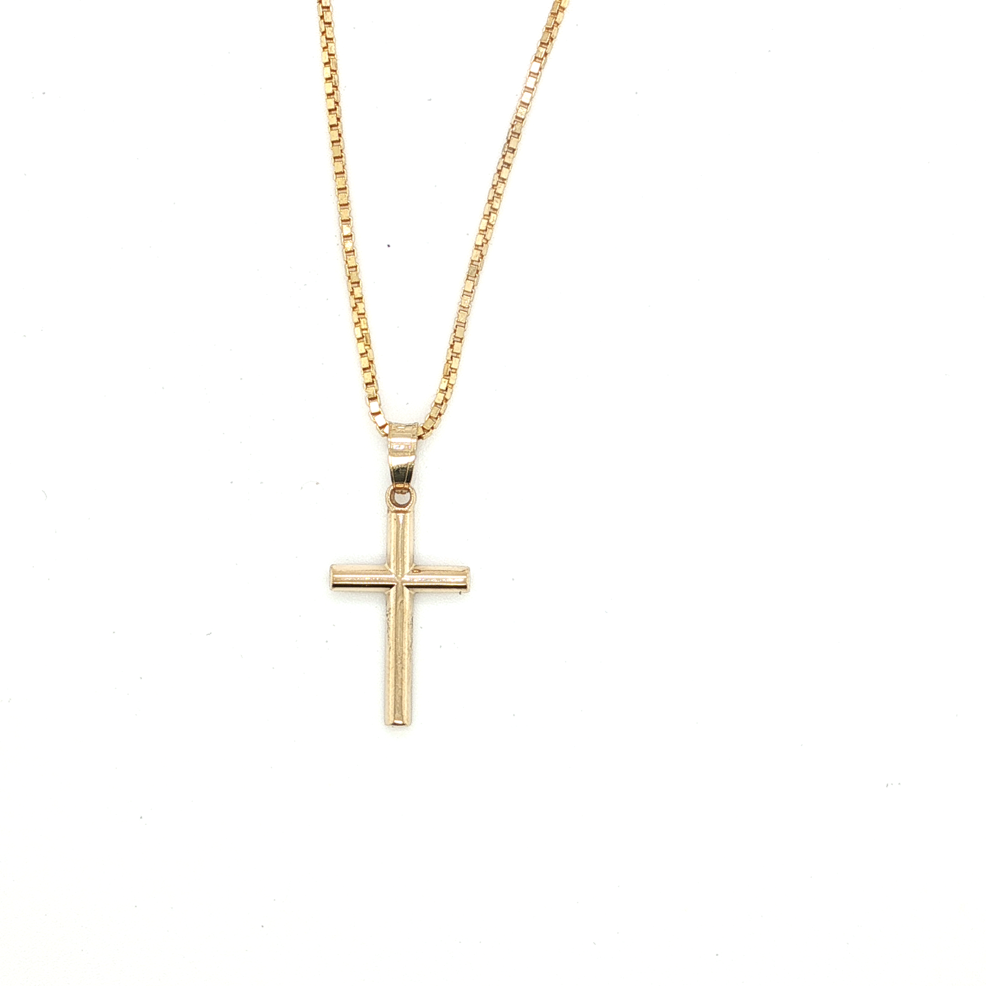 20" box chain (roughly 0.8-1mm width -- sturdy!) with simple 10k cross.