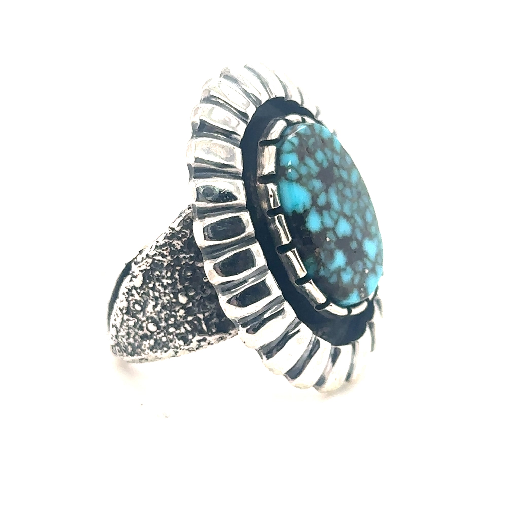 This statement ring features a center turquoise piece with daisy inspired details around it, set in Sterling Silver.