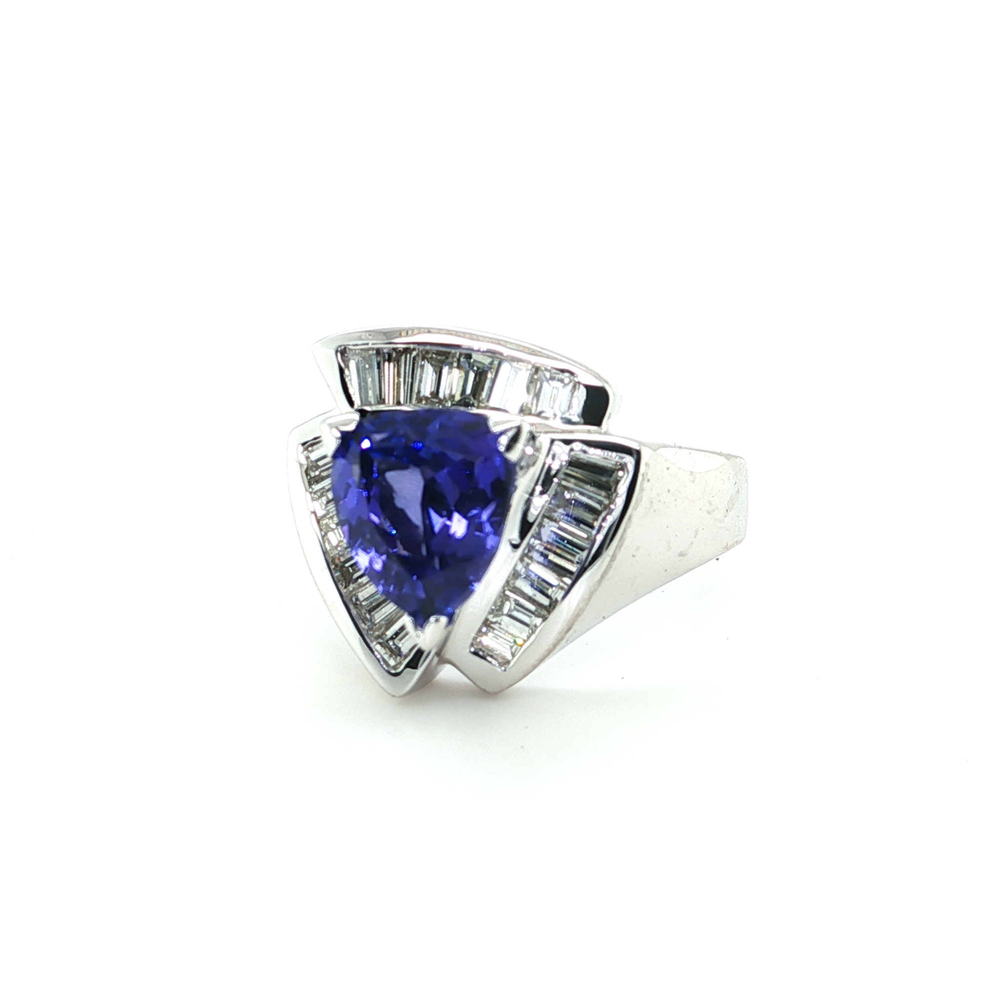 Presenting a captivating ring featuring a trillion cut tanzanite, known for its striking bluish purple hue. This uniquely designed ring showcases a mesmerizing blend of modern aesthetics and timeless elegance, making it a prized addition to any fine jewelry collection. Features baguette diamonds around the center tanzanite, from our consignment and estate collection.