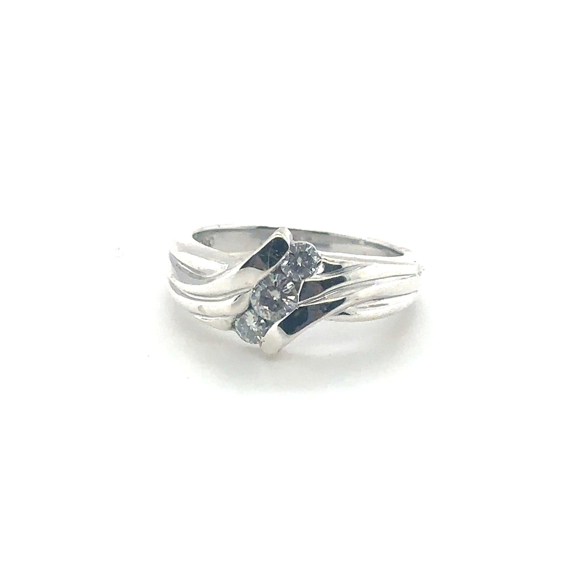 3 Round Cut Lab Diamonds set diagonally in a Sterling Silver ring.