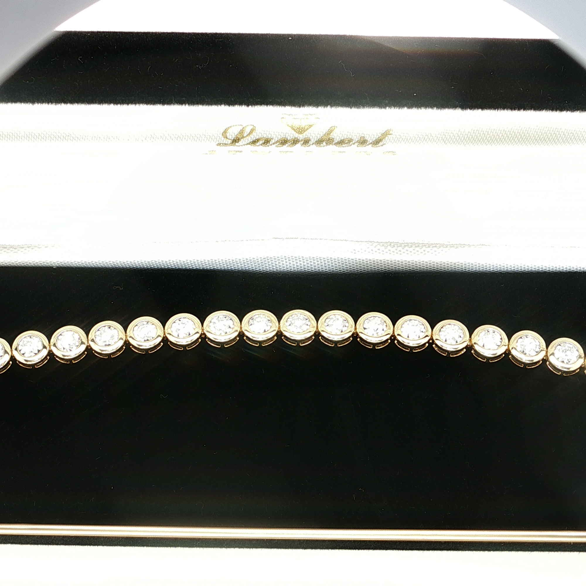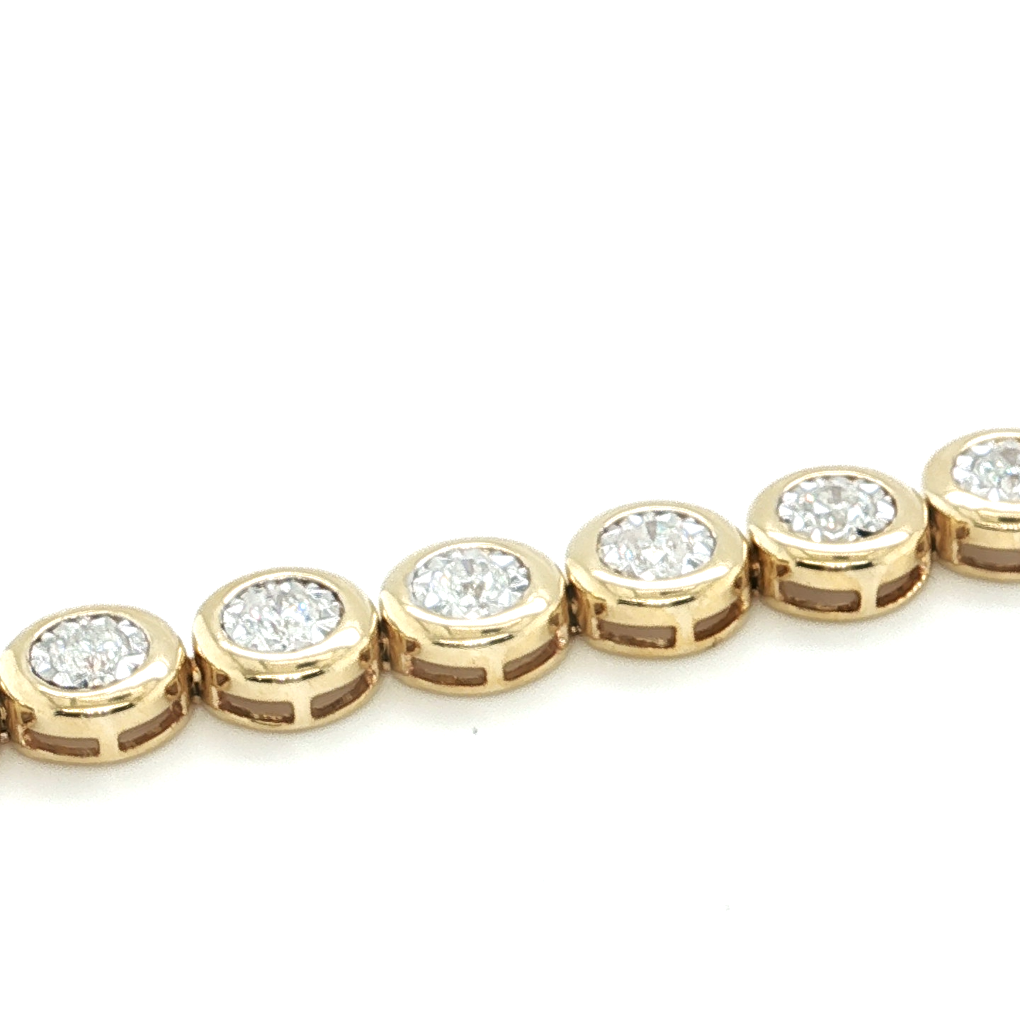 Exquisite 7" 10k yellow gold tennis bracelet featuring a series of dazzling, round brilliant cut bezel-set diamonds. This elegant bracelet showcases the timeless beauty of 2 carats worth of diamonds with exceptional cut, clarity, and brilliance.