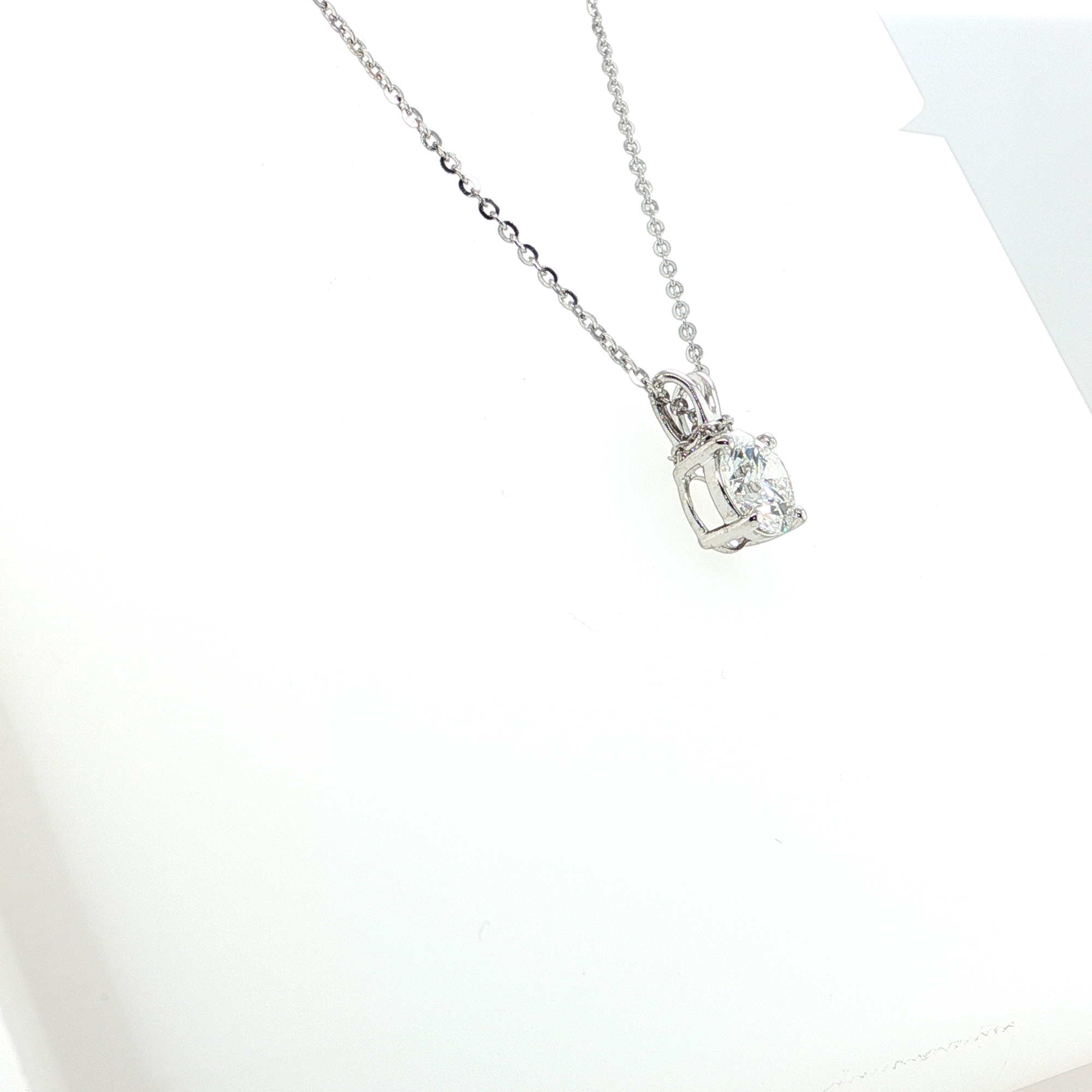 This 14K White Gold pendant features a large 2.09 ctw round lab grown diamond solitaire. It is IGI certified with VVS2 clarity, E color, ideal cut.