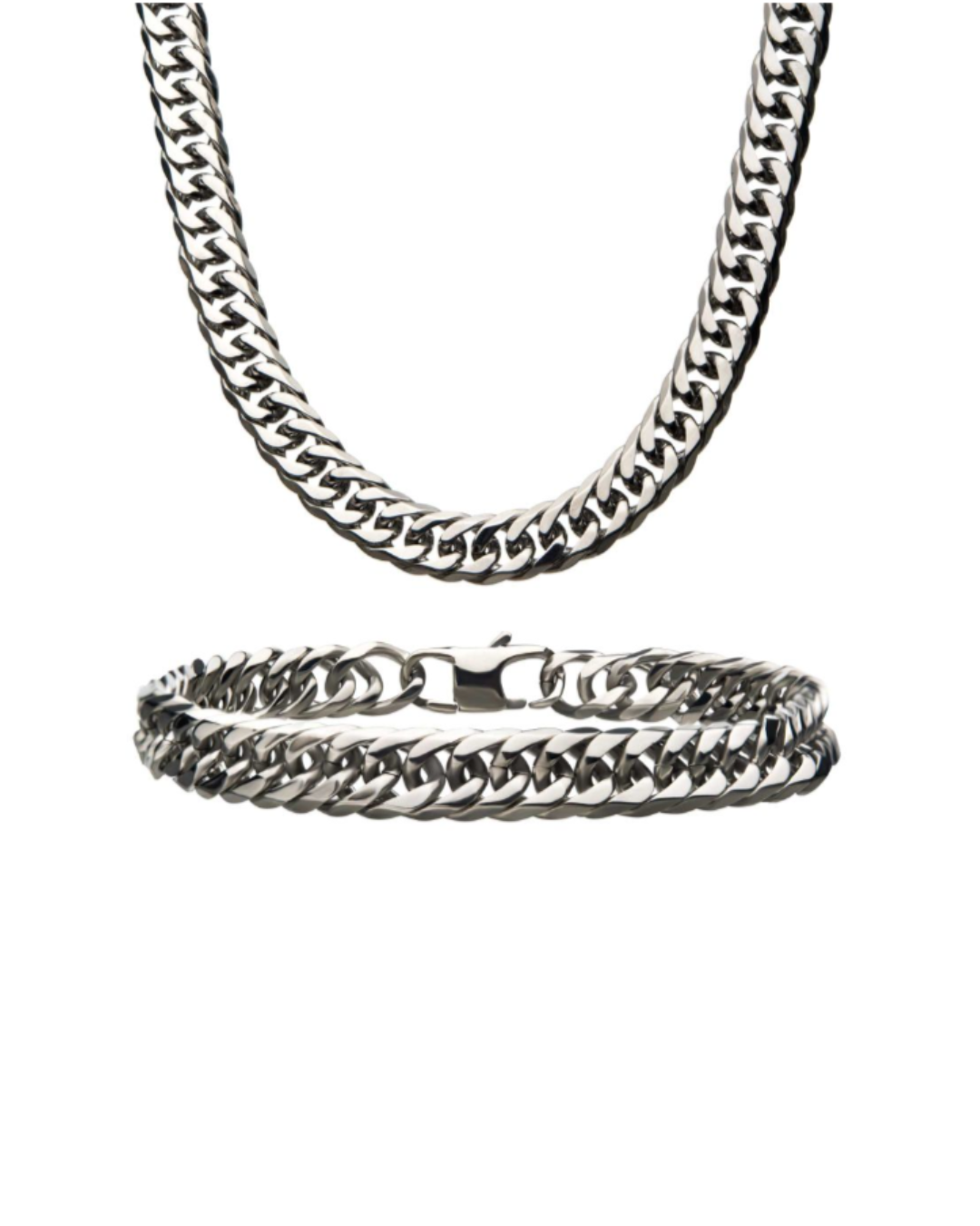 Celebrate Valentine's Day with this all-encompassing gift package that is sure to spoil the man in your life! The package includes a heavy Stainless Steel Curb Link Necklace (22 inches) and a matching Curb Link Bracelet (8"), a box of chocolates from local business, Winan's, a greeting card and a gift bag!