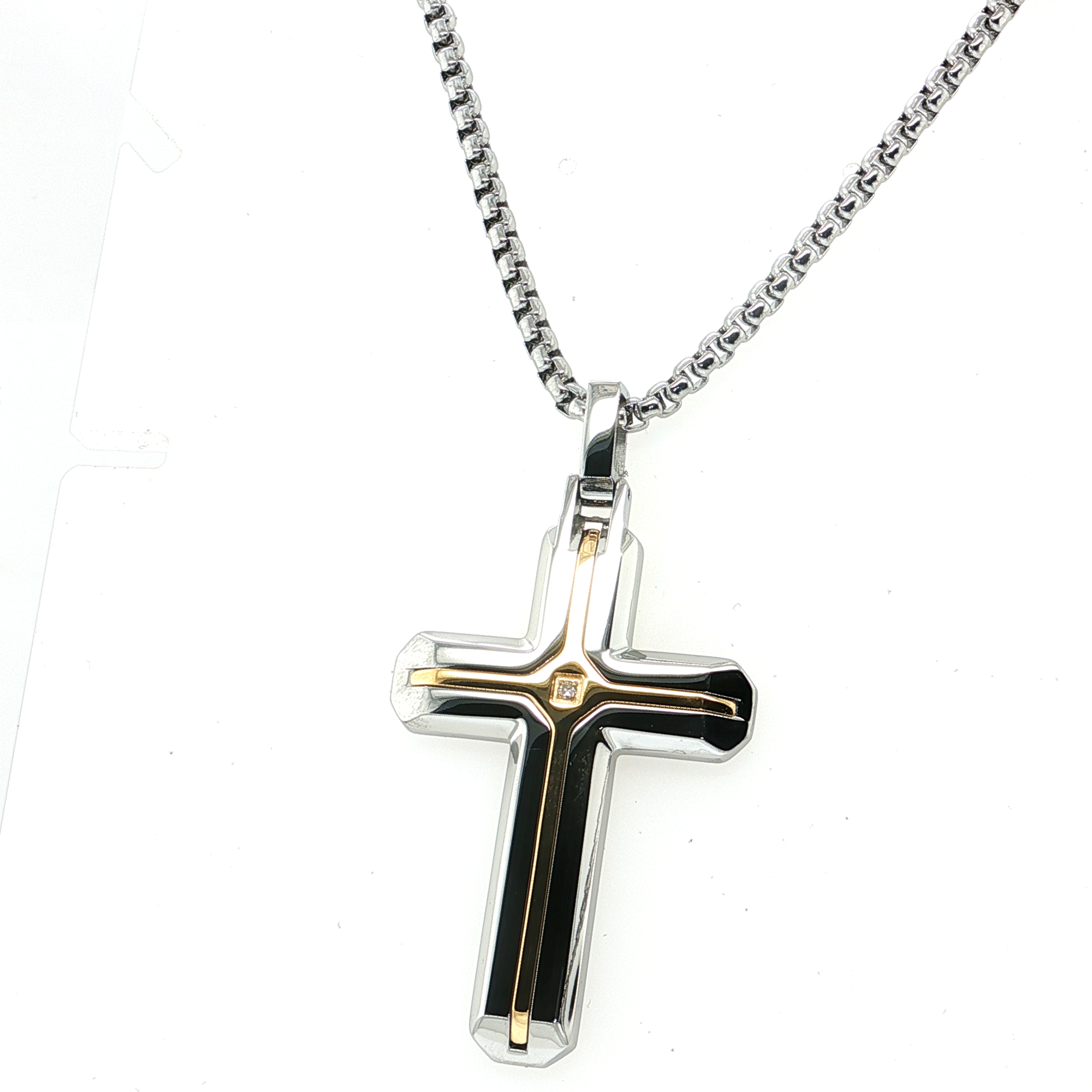 Elevate your style with this striking two-toned gent's cross featuring stainless steel with 18k yellow gold overlay. Comes on a 22 inch box chain